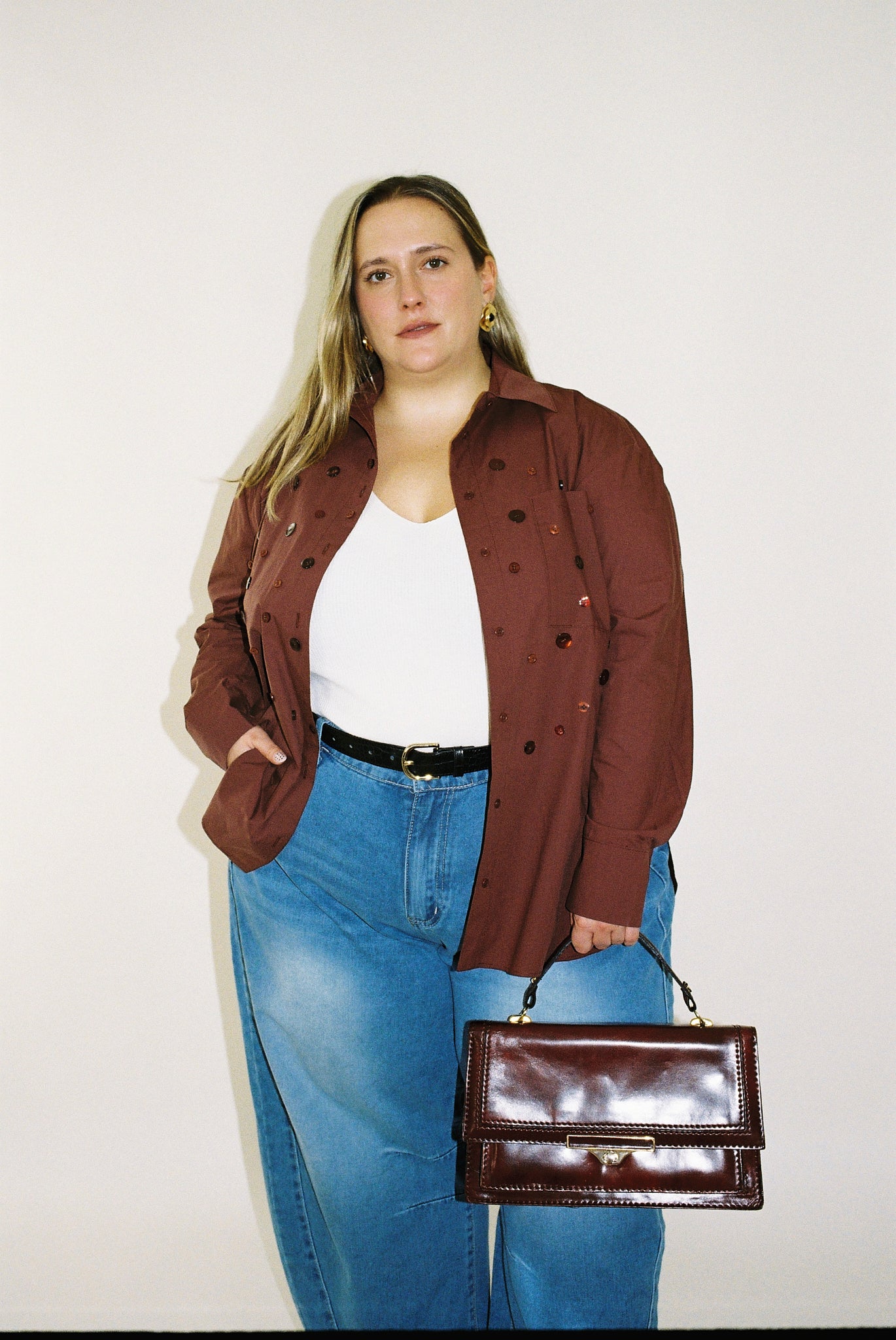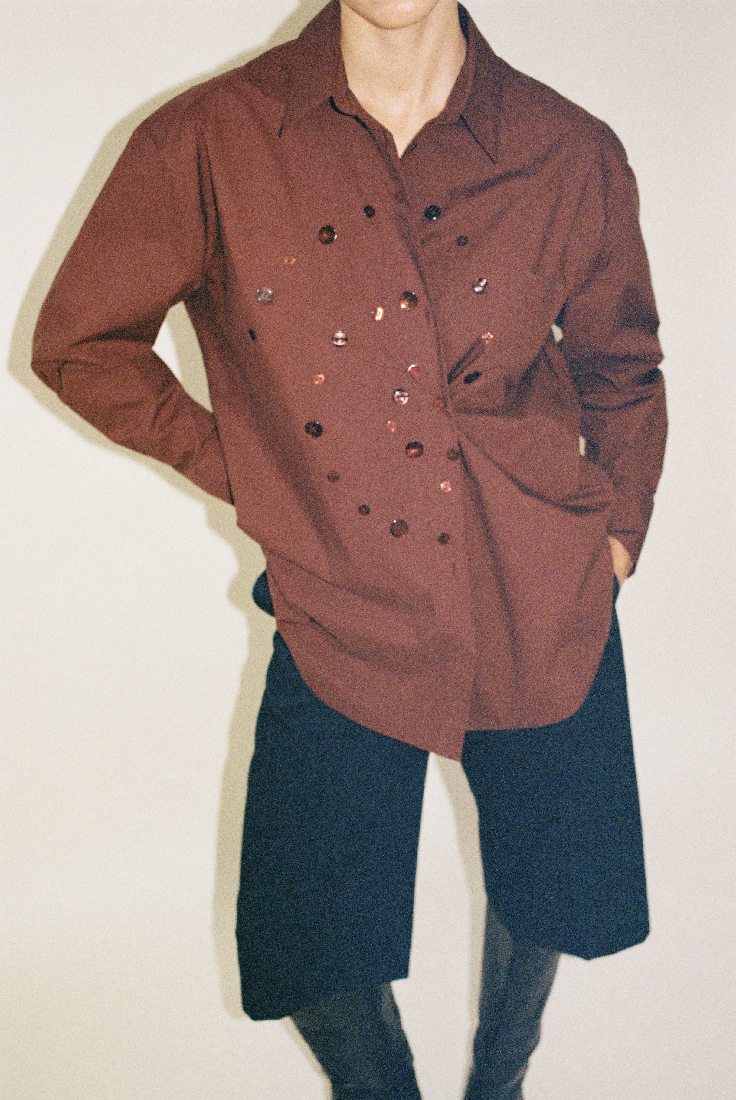 Each shirt received a handsewn spiral of buttons, adding a playful sparkle and new ways to button it up.