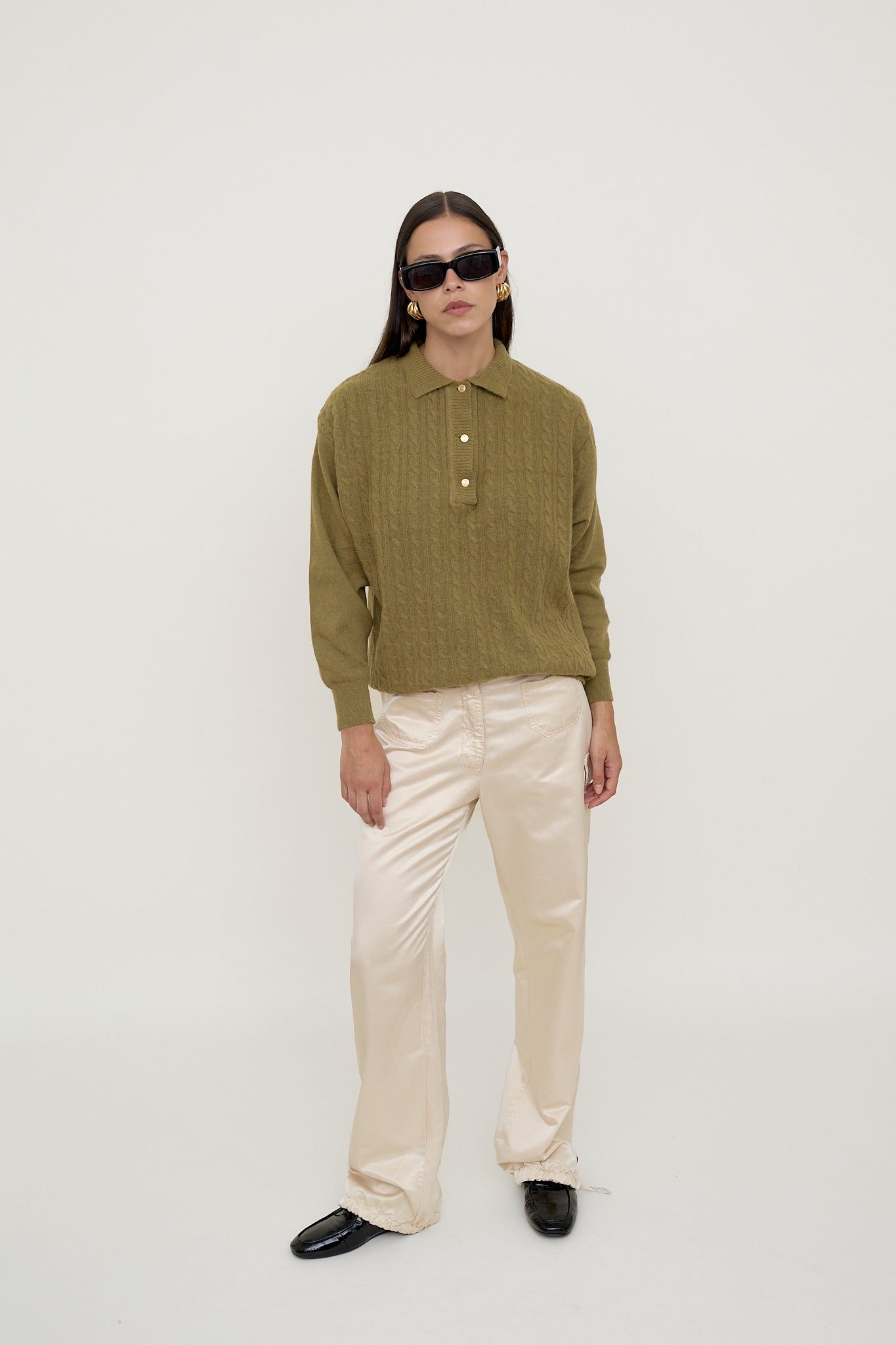 This knitted polo jumper combines a classic silhouette with intricate cable-knit detailing. The relaxed fit and soft texture make it a comfortable and versatile piece for any season.