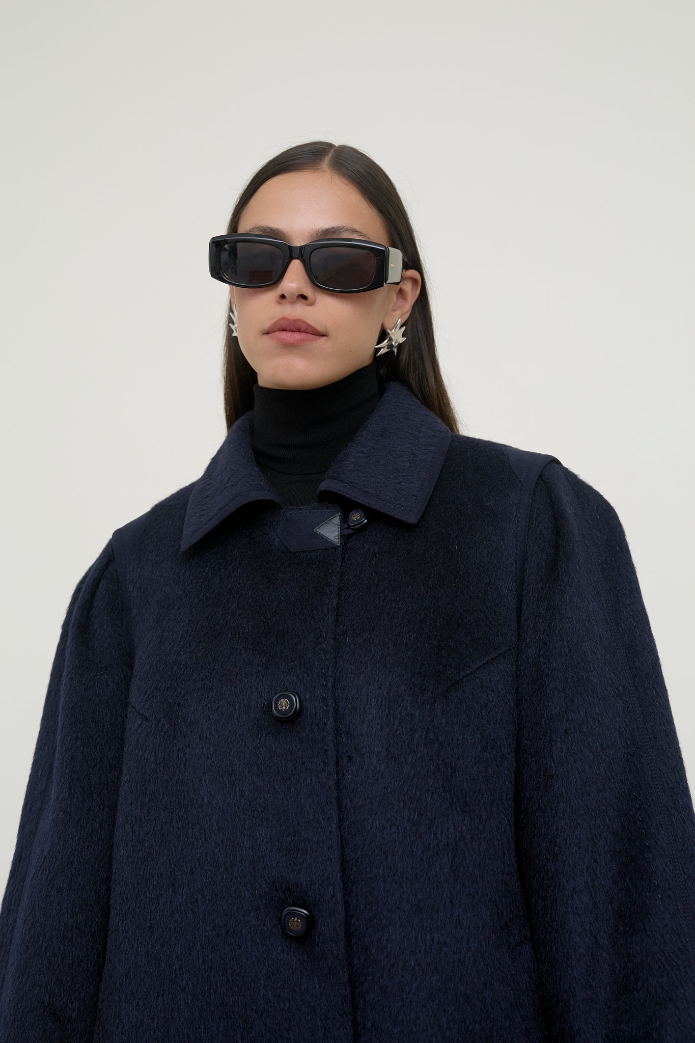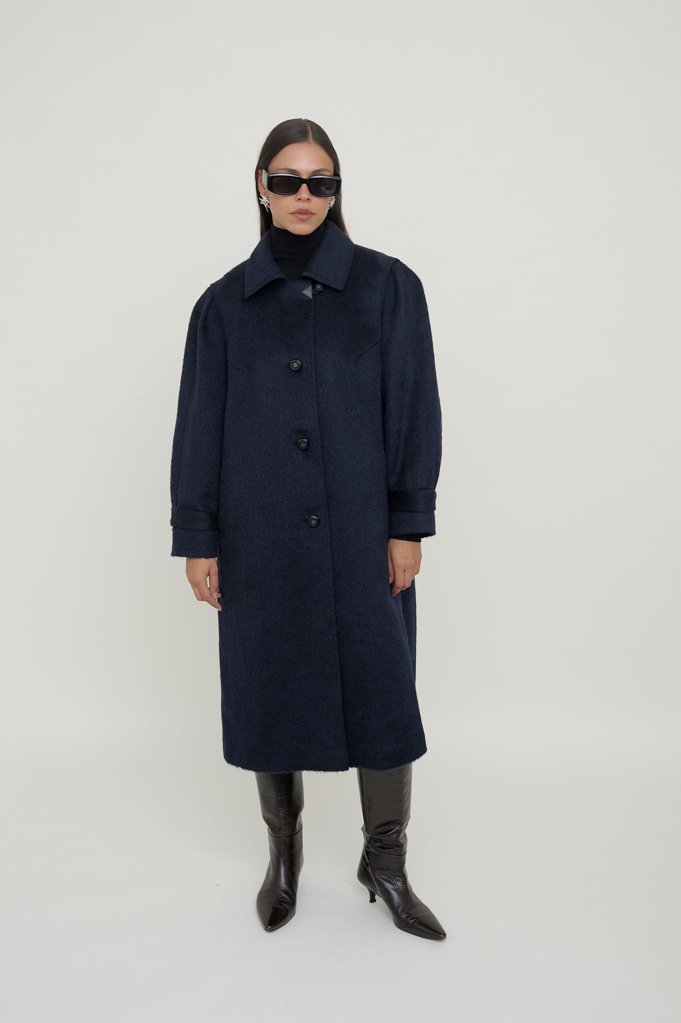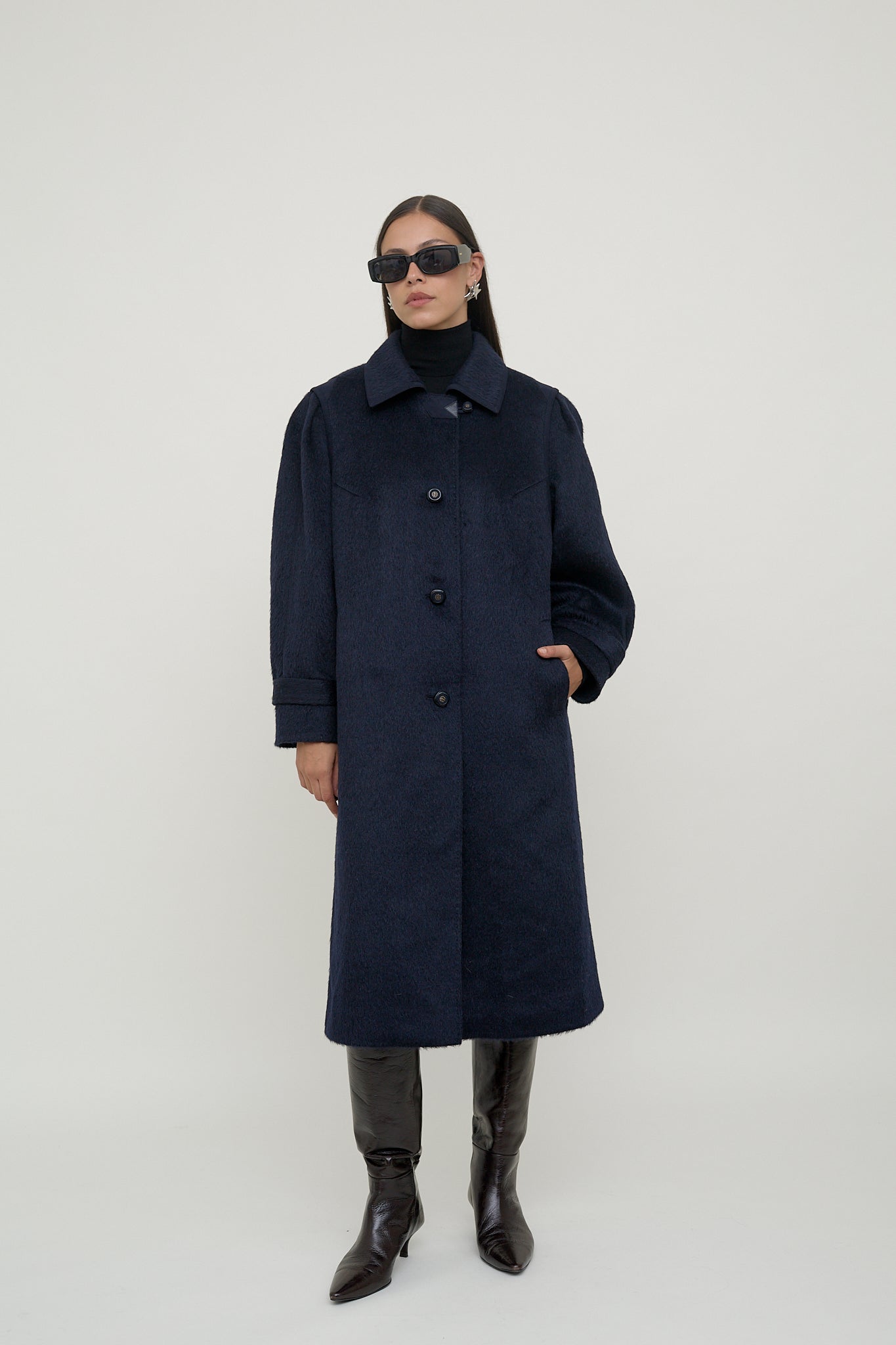 Crafted from a warm llama wool blend, this vintage coat features a rich, brushed texture in a deep navy hue. The design is detailed with a classic pointed collar, a button-through front, and gently puffed shoulders for a defined silhouette.