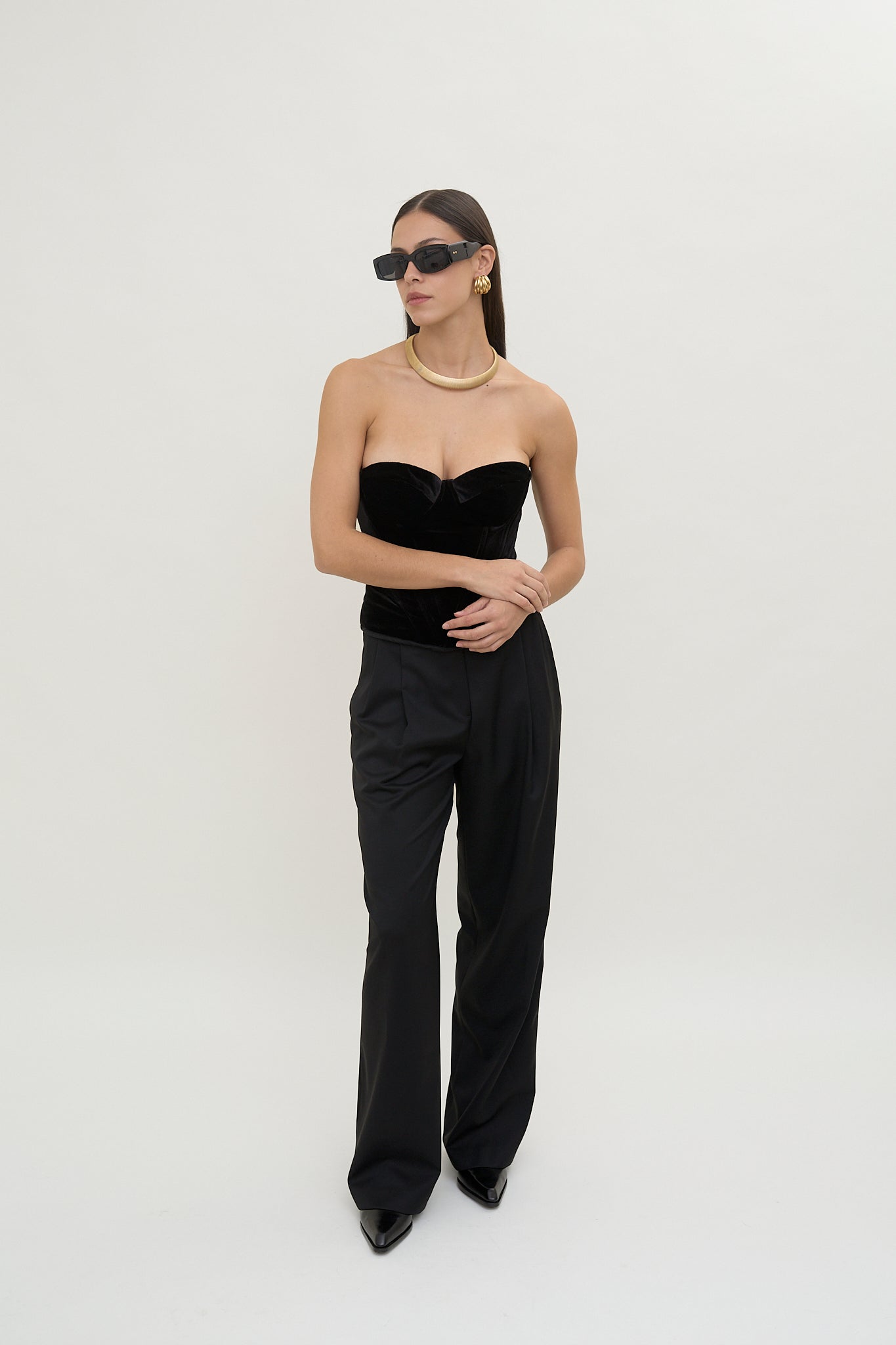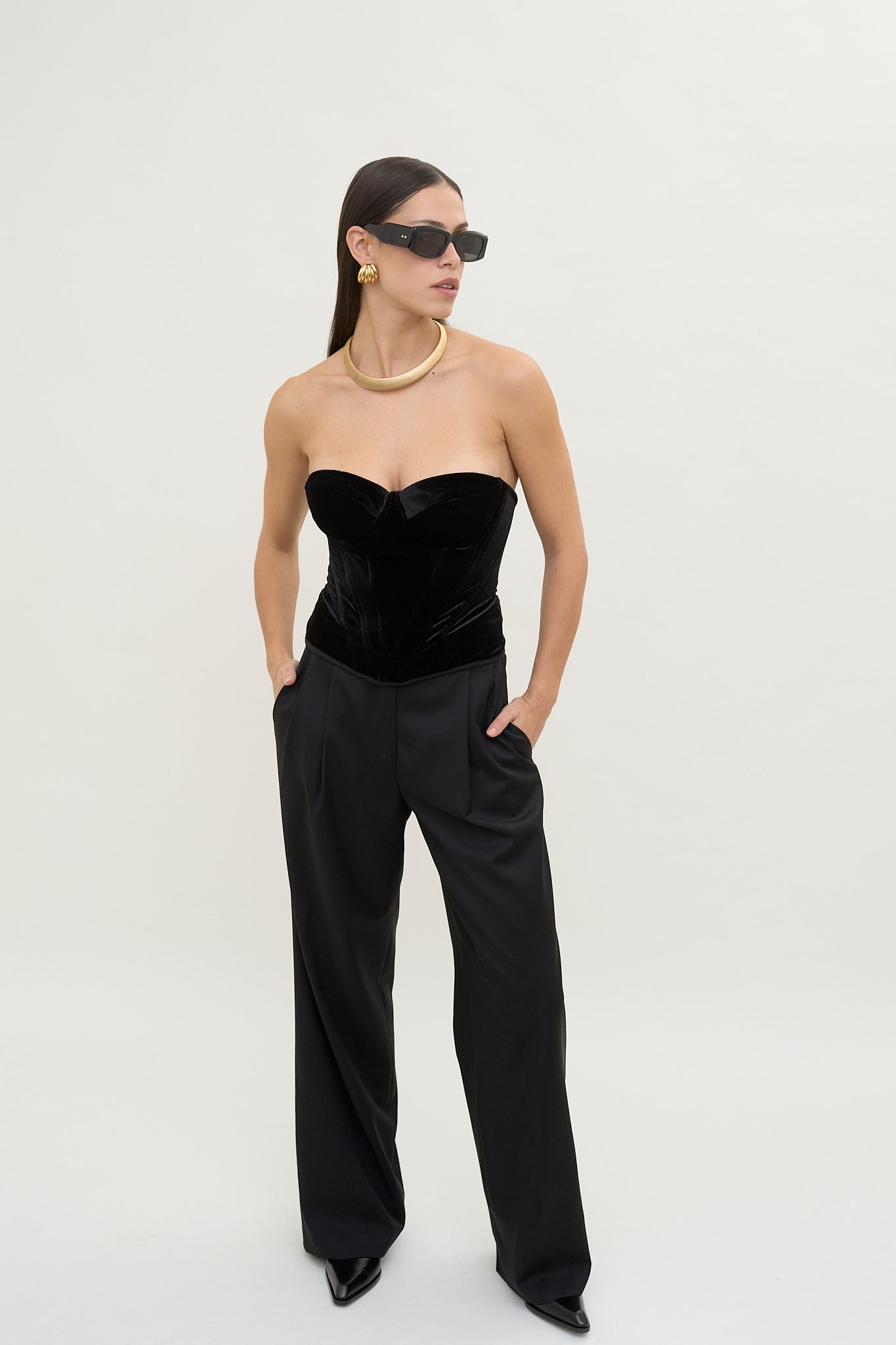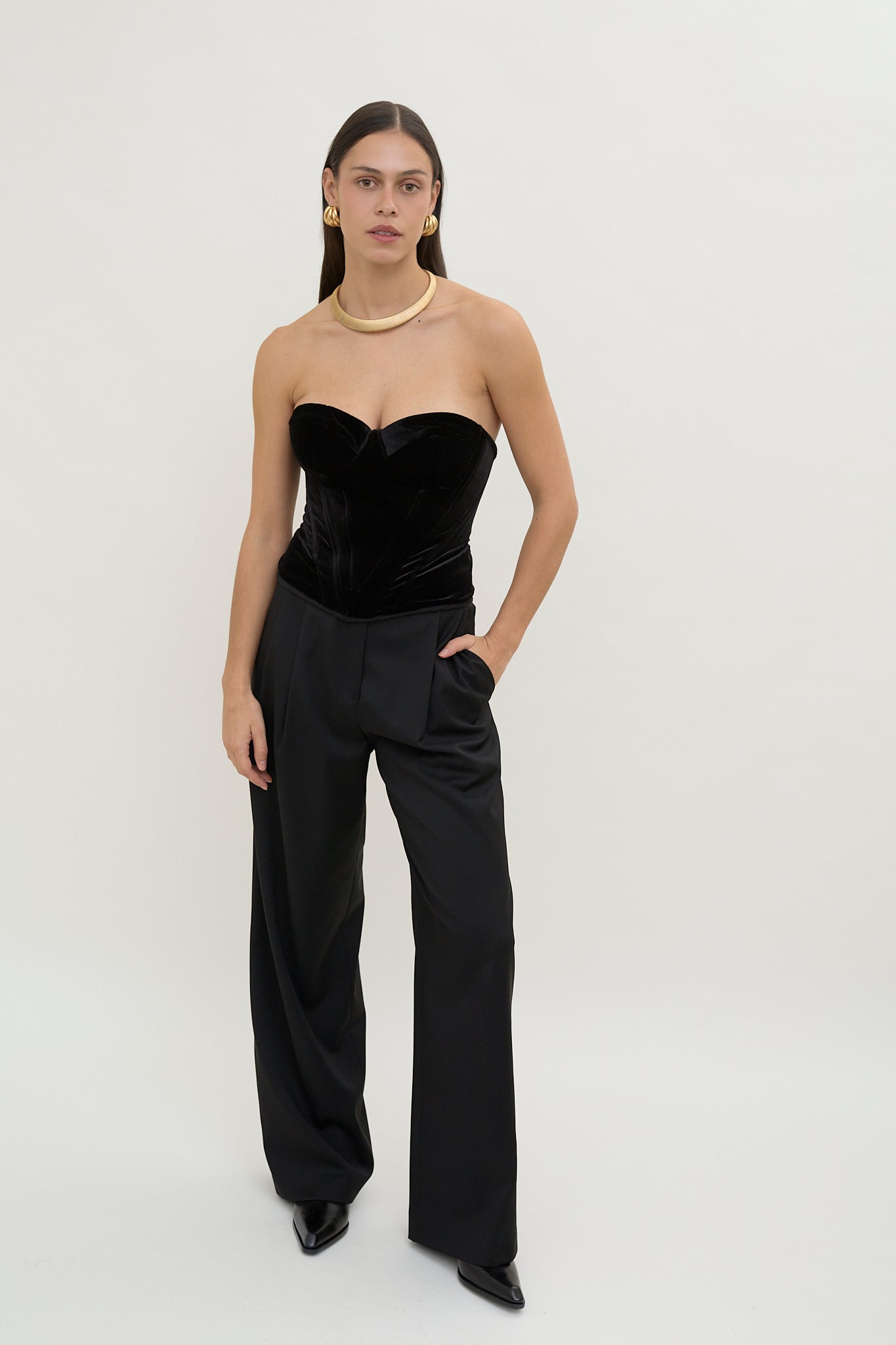 Crafted from plush black velvet, this top features a structured corset silhouette. The sculpted sweetheart neckline and strapless design create a defined, flattering shape.